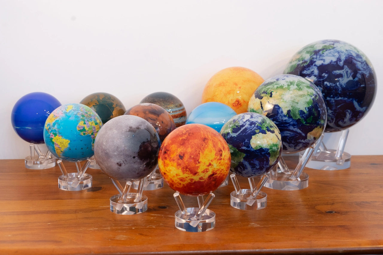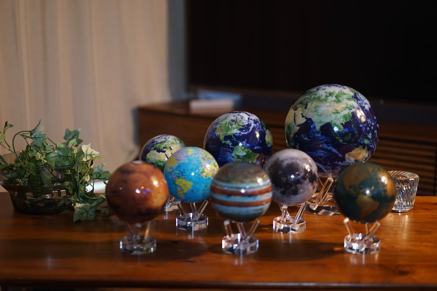 MOVA Globe(モバグローブ)とは、周囲の光を電力に変換し、地球の磁場を利用して静かに自転するコードレスの地球儀&天体モデルです。外側シェルは固定され、内側の球体だけがなめらかに回転します。地球はもちろん、月・火星・木星などの天体シリーズもラインナップしています。