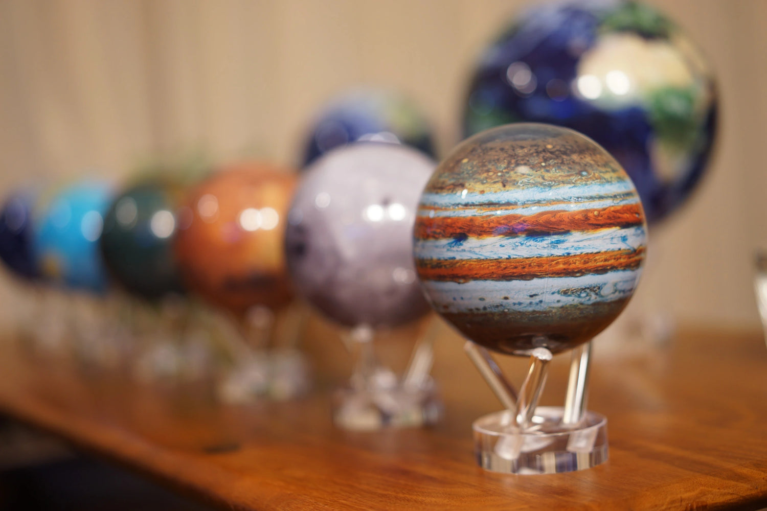 宇宙の表情をそのまま部屋へ。月のクレーター、火星の赤い大地、木星の雲帯と大赤斑のドラマチックな色彩まで、多彩な天体がラインナップ。光で自転する仕組みだから、置くだけで静かに回り続けます(電池・配線不要)。温かみのある照明やダークトーンの背景と好相性。サイズは4.5″/6.0″/8.5″展開で、贈り物にも喜ばれる定番シリーズです。