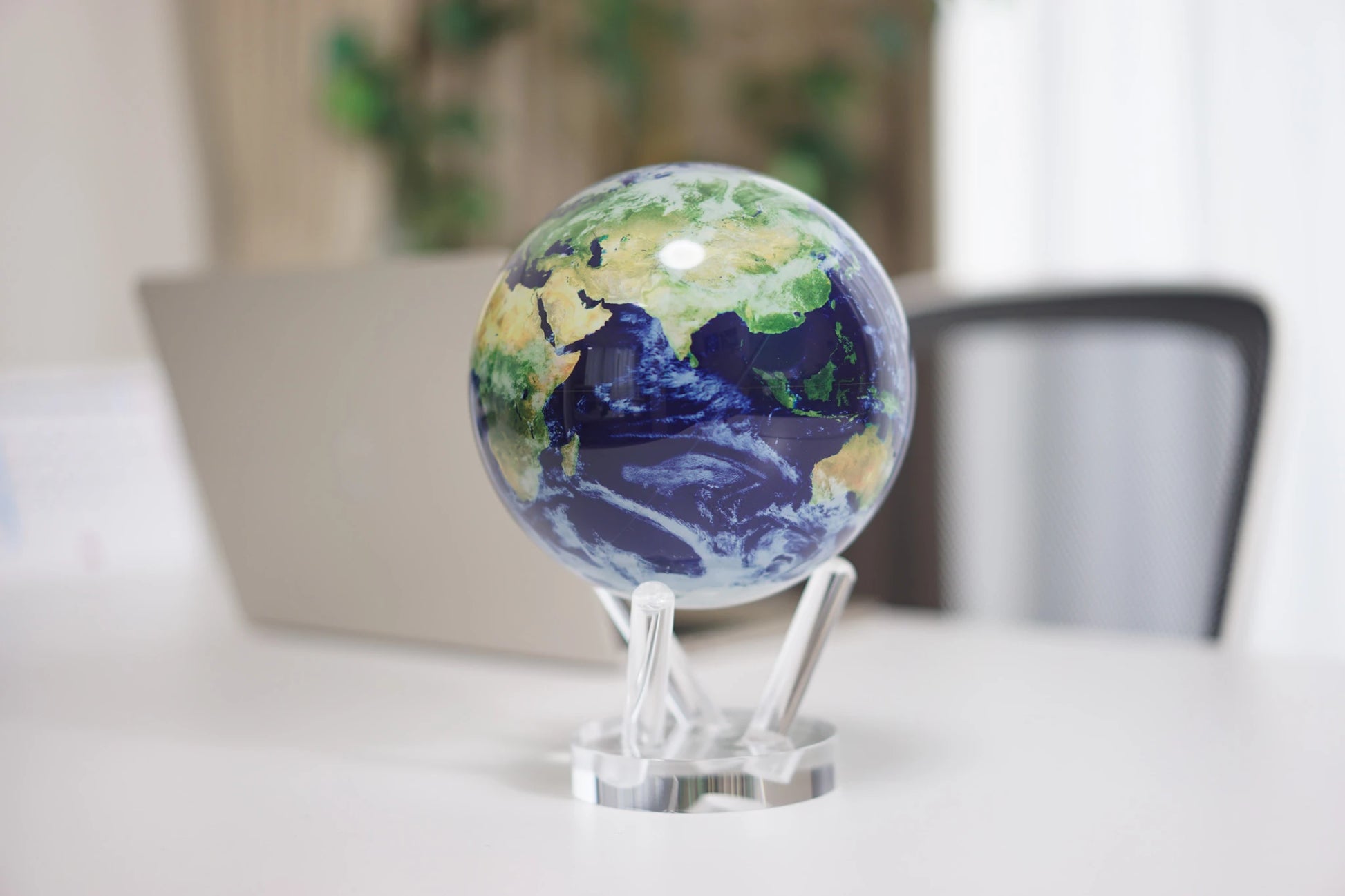 「Earth with Clouds」は、雲層まで表現した人気の地球モデル。室内の光だけで静かに自転し、宇宙からの眺めのような没入感を生み出します。電池・配線は不要、外側シェルは固定、内球だけがなめらかに回転します。