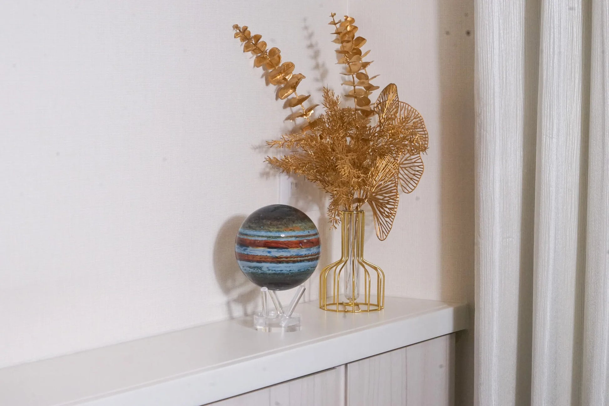 「Jupiter」は、力強い縞模様と温かい色調が魅力の天体モデル。室内の光でゆっくり自転し、電池・配線は不要。外側シェルは固定、内球だけがなめらかに回転します。